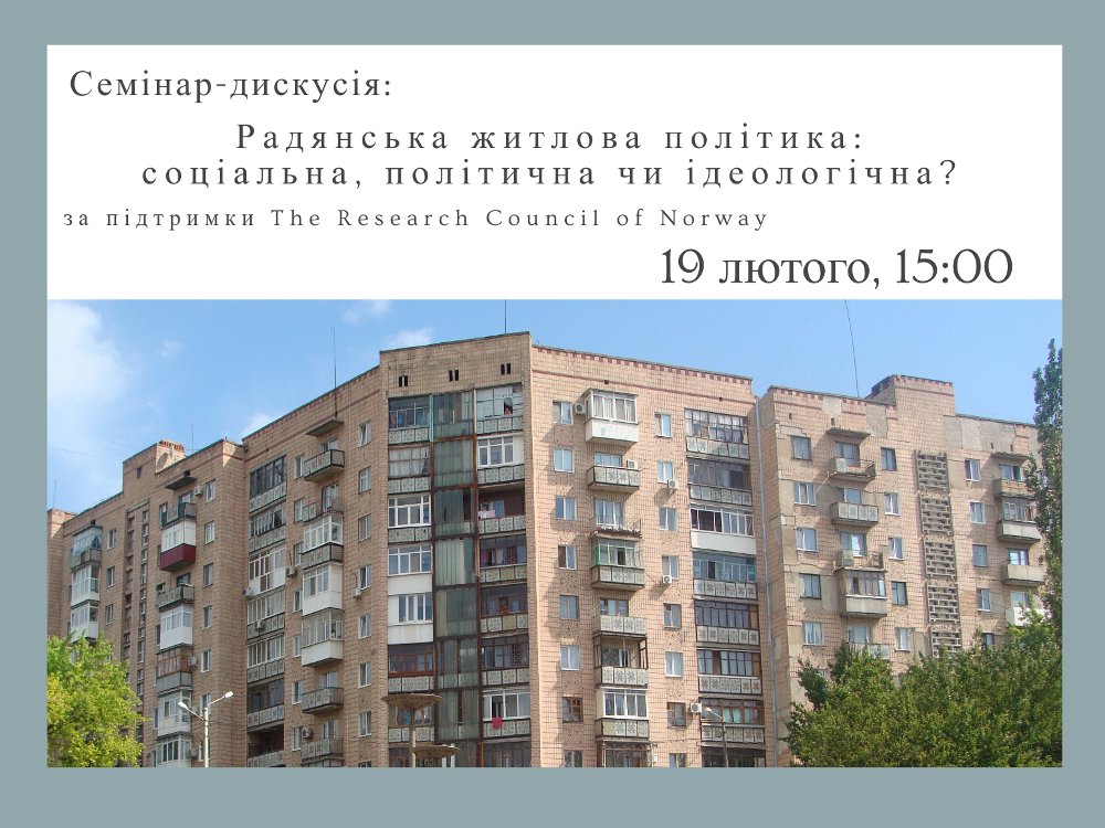 В рамках Міжнародного проекту «Українські міста на лінії геополітичного розлому: міська ідентичність, геополітика та міська політика», що підтримується Норвезьким дослідницьким фондом та виконується в Інституті географії НАН України сектор територіальної організації суспільства і кафедра економічної та соціальної географії КНУ ім. Тараса Шевченка 19 лютого 2021 року планують проведення семінару-дискусії «Радянська житлова політика: соціальна, політична чи ідеологічна?».
